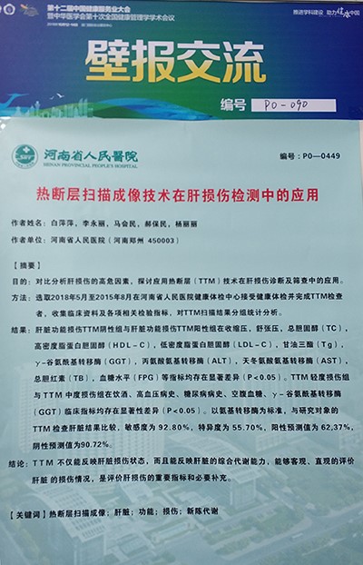大會壁報展示了河南省人民醫(yī)院的《熱斷層掃描成像技術(shù)在肝損傷檢測中的應(yīng)用》學(xué)術(shù)論文,文章對比分析了肝損傷的高危因素,探討應(yīng)用熱斷層(TTM)技術(shù)在肝損傷診斷及篩查中的應(yīng)用,結(jié)論表明TTM不僅能反應(yīng)肝損傷狀態(tài),而且能反應(yīng)肝臟的綜合代謝能力,能夠客觀、直觀的評價肝臟的損傷情況,是評價肝損傷的重要指標(biāo)和必要補充。